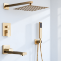 取り付けは簡単で、必要なハードウェアがすべて含まれているため、新築とバスルームの改修の両方に最適です。毎日のシャワー ルーチンをアップグレードしたい場合でも、ご自宅に贅沢なタッチを加えたい場合でも、ハンドヘルド スプレーと浴槽の蛇口を備えたこのゴールド スクエア レイン シャワー システムは、スタイル、パフォーマンス、実用性を 1 つの優れたパッケージにまとめた理想的なソリューションです。